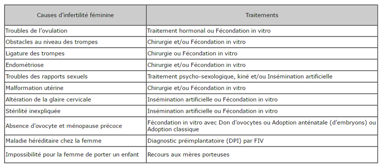 Différentes causes d’infertilité féminine et leur prise en charge adaptée est schématiquement résumée dans le tableau suivant, où à chaque problème spécifique correspond une solution (la liste n’est pas exhaustive et ne tient pas compte du contexte culturo-religieux) :