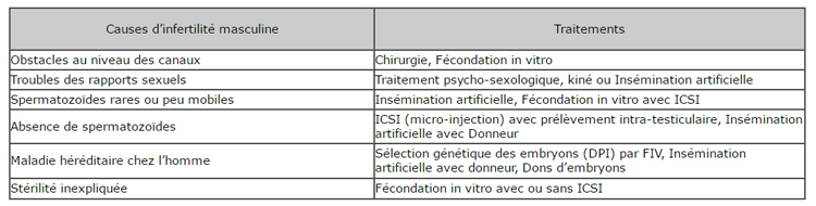 Différentes causes d’infertilité masculine et leur prise en charge adaptée est schématiquement résumée dans le tableau suivant, où à chaque problème spécifique correspond une solution (la liste n’est pas exhaustive et ne tient pas compte du contexte culturo-religieux) :